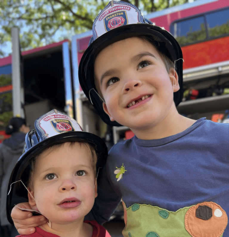 Declan O’Leary, five, and his brother John Paul O’Leary, 2, go to the Evanston Fire Department on Saturday open day. “They are exceptionally attracted to fire trucks,” dad Joe O’Leary said. (Right now photo by Richard Cahan)