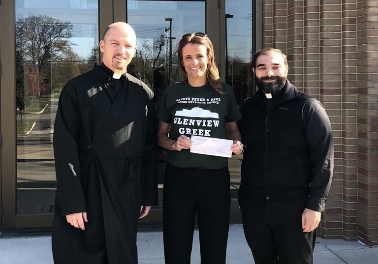 The Rev. Richard Demetrius Andrews (left), pastor, and Rev. Fr. Panagiotis Boznos (right), of Saints Peter and Paul Greek Orthodox Church, present a check to Renée Dominguez (center), executive director of the Family Service Center , a mental health agency serving Glenview, Wilmette, Northbrook and Kenilworth. The donation represents a portion of the church’s 2019 Greek Festival proceeds.
