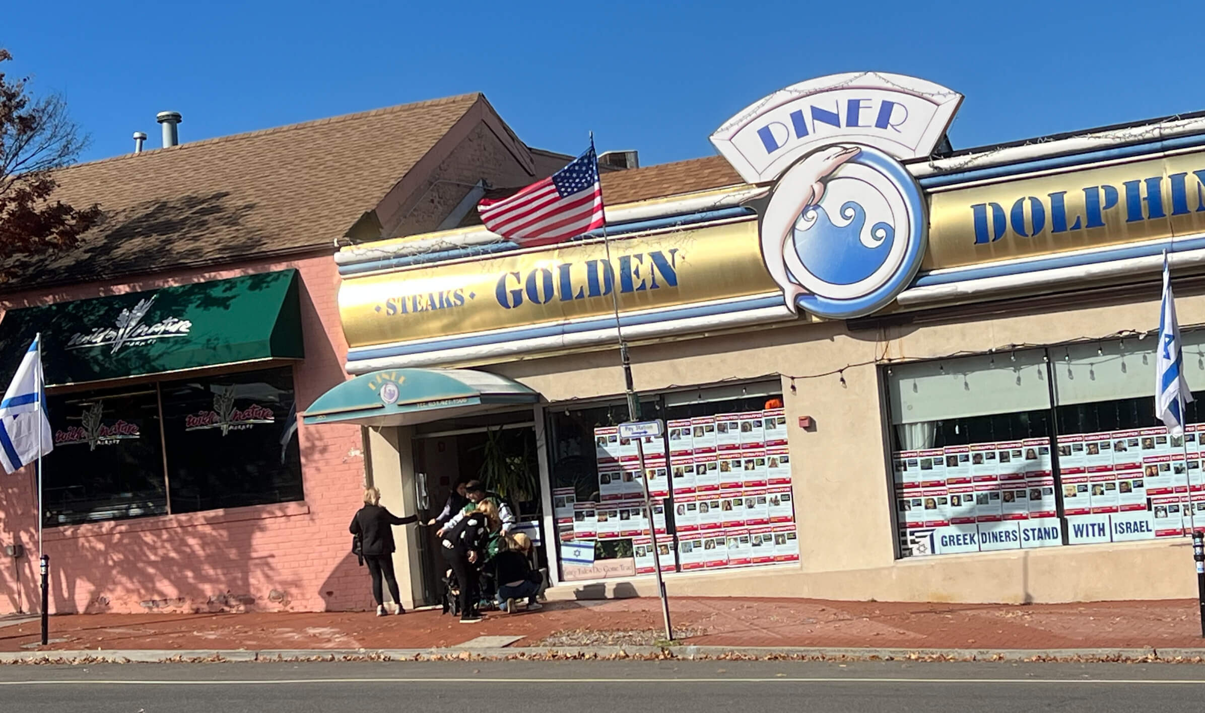 Four Israeli flags fly outside the Golden Dolphin Diner and its windows are covered with rows of photos of hostages kidnapped by Hamas. A sign below the images reads: “Greek diners stand with Israel.”