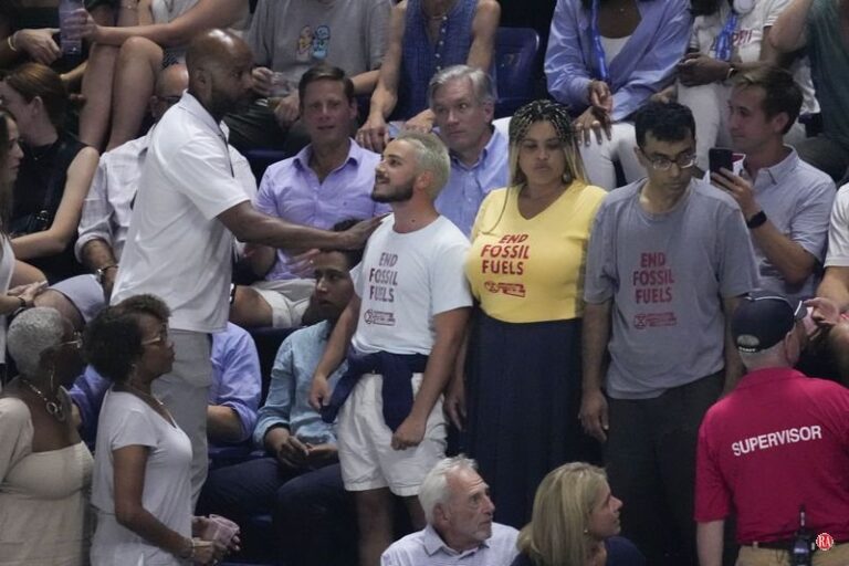 NEW YORK — Coco Gauff’s victory over Karolina Muchova in the US Open semi-final was delayed 50 minutes at the start of the second set due to a disturbance caused by four environmental activists in the stands at Arthur Ashe Stadium. A protester stuck his feet to the concrete floor Thursday evening. Three demonstrators were quickly expelled. They wore shirts that read “End Fossil Fuels.” All four were taken into custody. The players returned to the field after waiting out the delay in the locker room and the match resumed. Gauff won 6-4, 7-5.